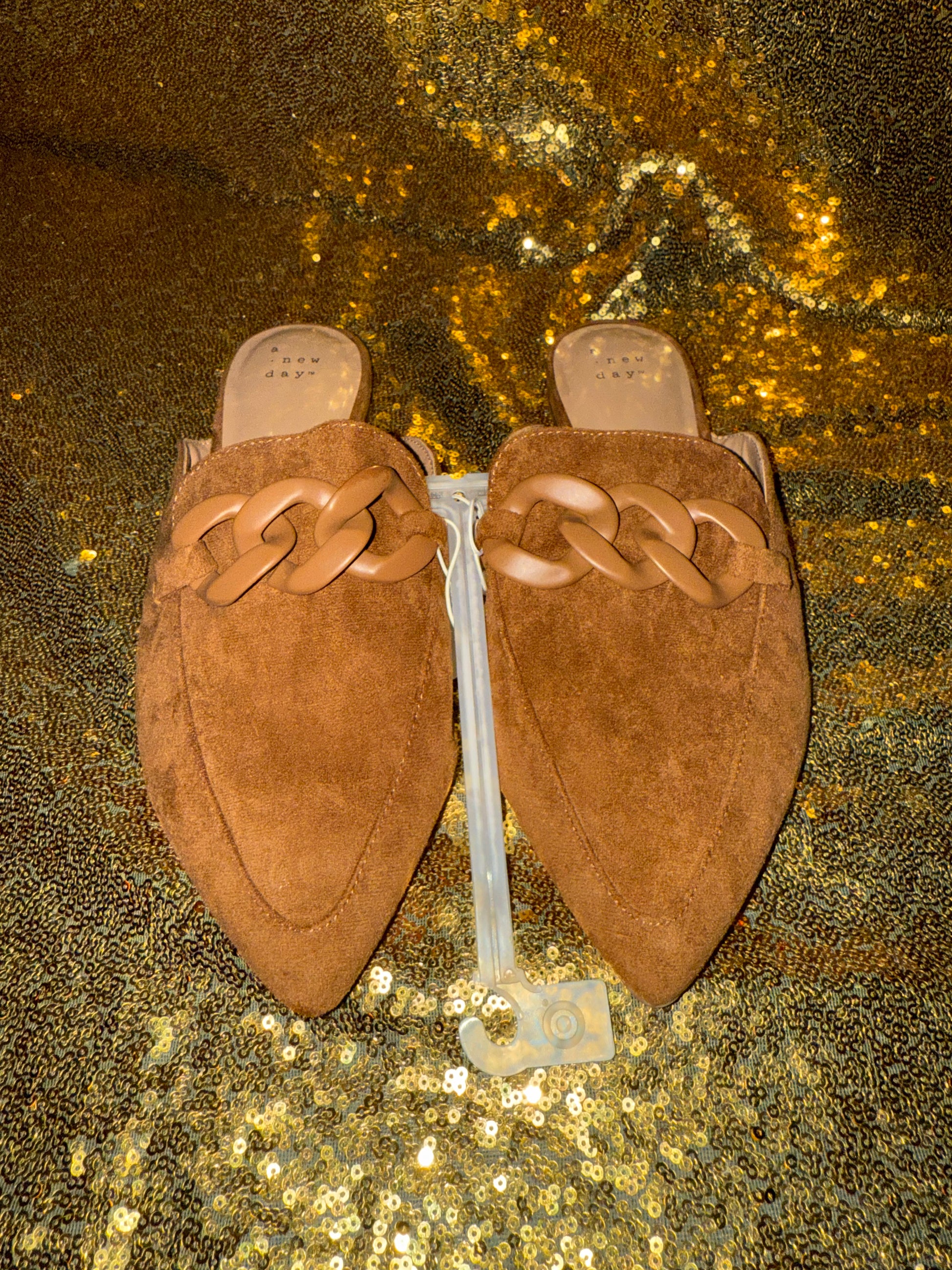 Camel colored faux suede slide in with plastic chain buckle on top
